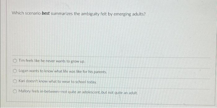 Which scenario best summarizes the ambiguity felt by emerging adults. C Adolescence is generally viewed as beginning with the. Which scenario best summarizes the ambiguity felt by emerging adults.